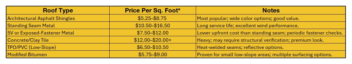 *Estimates include typical tear‑off, disposal, standard underlayment, and code metals. Exact pricing depends on square footage, complexity, product line, underlayment package, wood repairs, and market conditions.